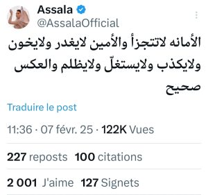 نشرت الفنانة السورية أصالة منشورا قالت فيه: “الأمانة لا تتجزأ والأمين لا يغدر ولا يخون ولا يكذب ولاز يستغل ولا يظلم والعكس صحيح”.