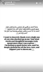 وكتبت عبر خاصية الستوري على “إنستغرام”: “بشكر كل شخص سأل واطمن عليا، وجودكم ورسائلكم فرقوا معايا أكتر مما تتخيلوا، الحمد لله أنا أحسن بكتير دلوقتي وممتنة لكل الحب”.
