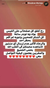وأشارت إلى أن قرارها بالابتعاد عن السوشيال ميديا جاء حفاظًا على سلامها النفسي، وختمت بنبرة وداع قائلة: “إلى اللقاء، أو ربما وداعاً طويلاً… أحبكم”.