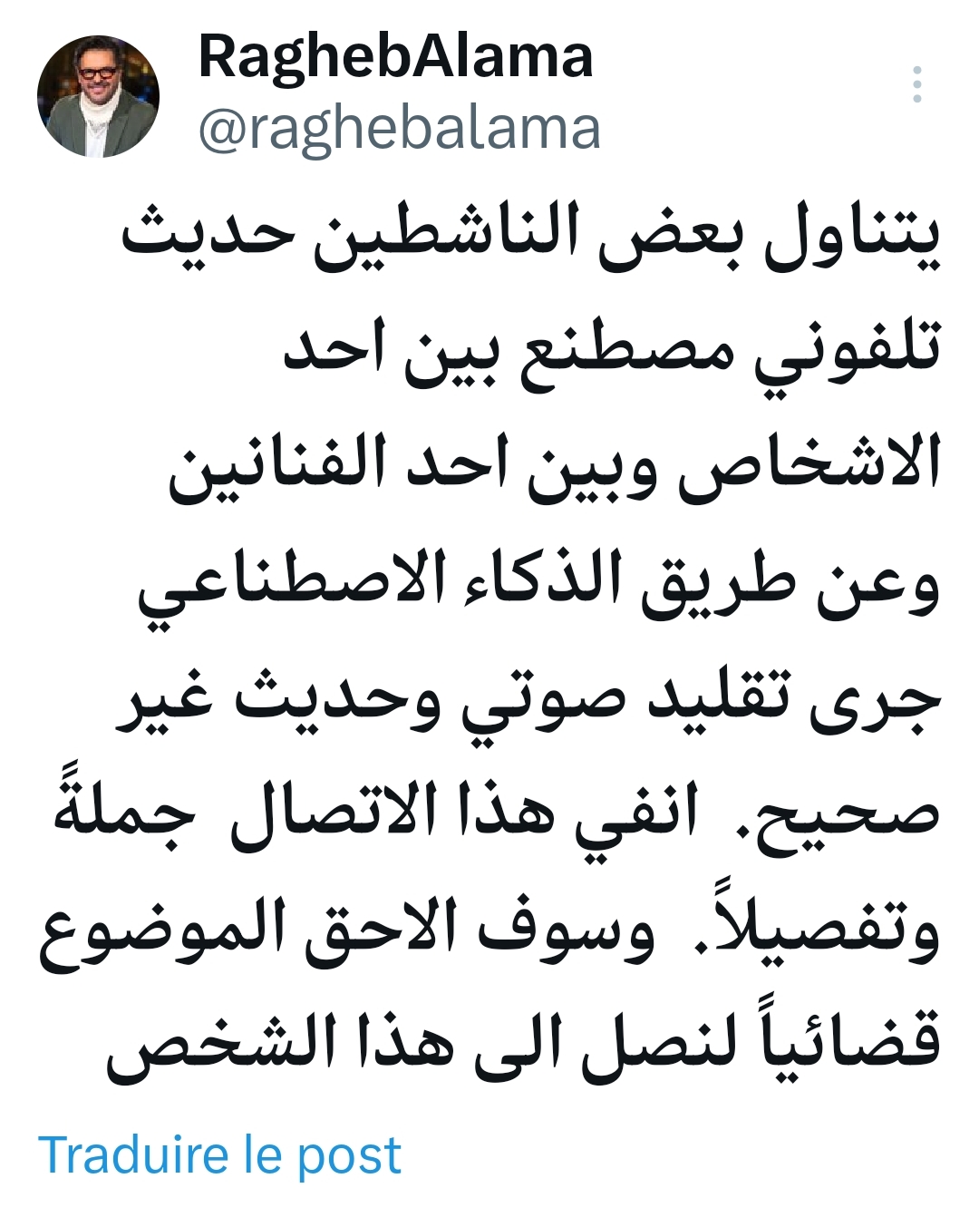 نشر الفنان راغب علامة مؤخرًا بيانًا عبر حساباته على وسائل التواصل الاجتماعي، يعلن فيه نفيه القاطع لتسجيل صوتي مزيف تم تداوله يظهر محادثة بينه وبين أحد الأفراد.