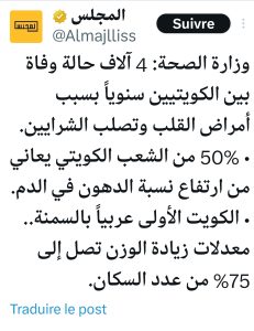 تشير إحصائيات وزارة الصحة إلى وفاة 4 آلاف كويتي سنويًا بسبب أمراض القلب وتصلب الشرايين، حيث يعاني 50% من السكان من ارتفاع نسبة الدهون في الدم.
