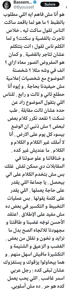 نشر الإعلامي باسم يوسف ردا على اتهامات البعض بأنه يتاجر بالقضيّة والصمت، واصفًا أن كل ردود أفعاله تُؤخذُ بطريقة سلبيةٍ من البعض، قائلا: