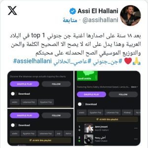 وشارك صورًا تُظهر صدارة الأغنية، مؤكدًا عبر “إكس” أن هذا النجاح الطويل الأمد يثبت جودة عناصر الأغنية من كلمة ولحن وتوزيع، واختتم منشوره بشكر جمهوره على محبتهم.