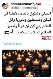 كتبت شكران مرتجى: “لنصلي ونبتهل بالدعاء لأهلنا في لبنان وفلسطين وسوريا وكل العالم ربي كن لن عوناً ونصيراً السلام السلام السلام يا الله”