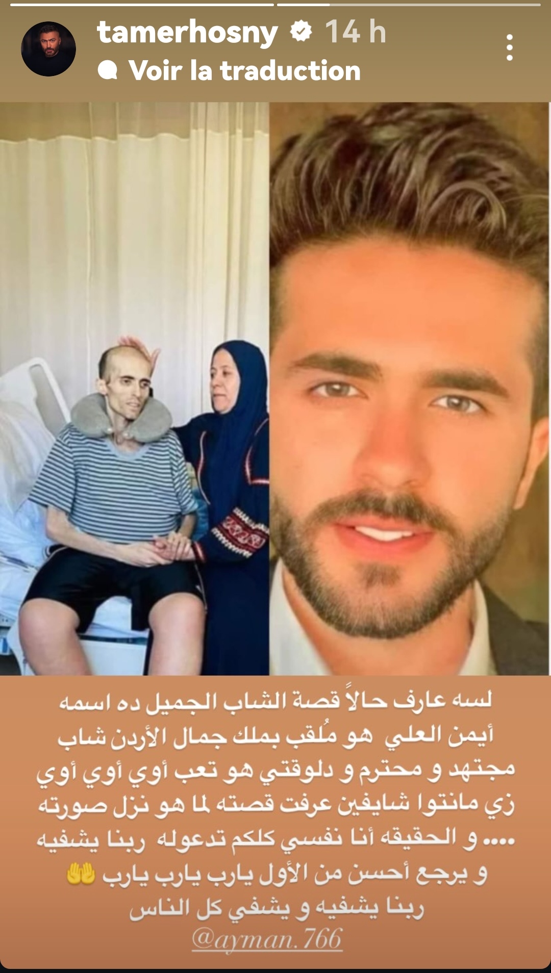 وأرفق تامر رسالةً تمنّى فيها الشّفاء العاجل لأيمن، بالرغم من أنه لا يعرف قصّته من قبل، لكن تعاطف كثيرين معه استوقفَ انتباهه ليكتب عنه ويتمنى له كامل الصحة.