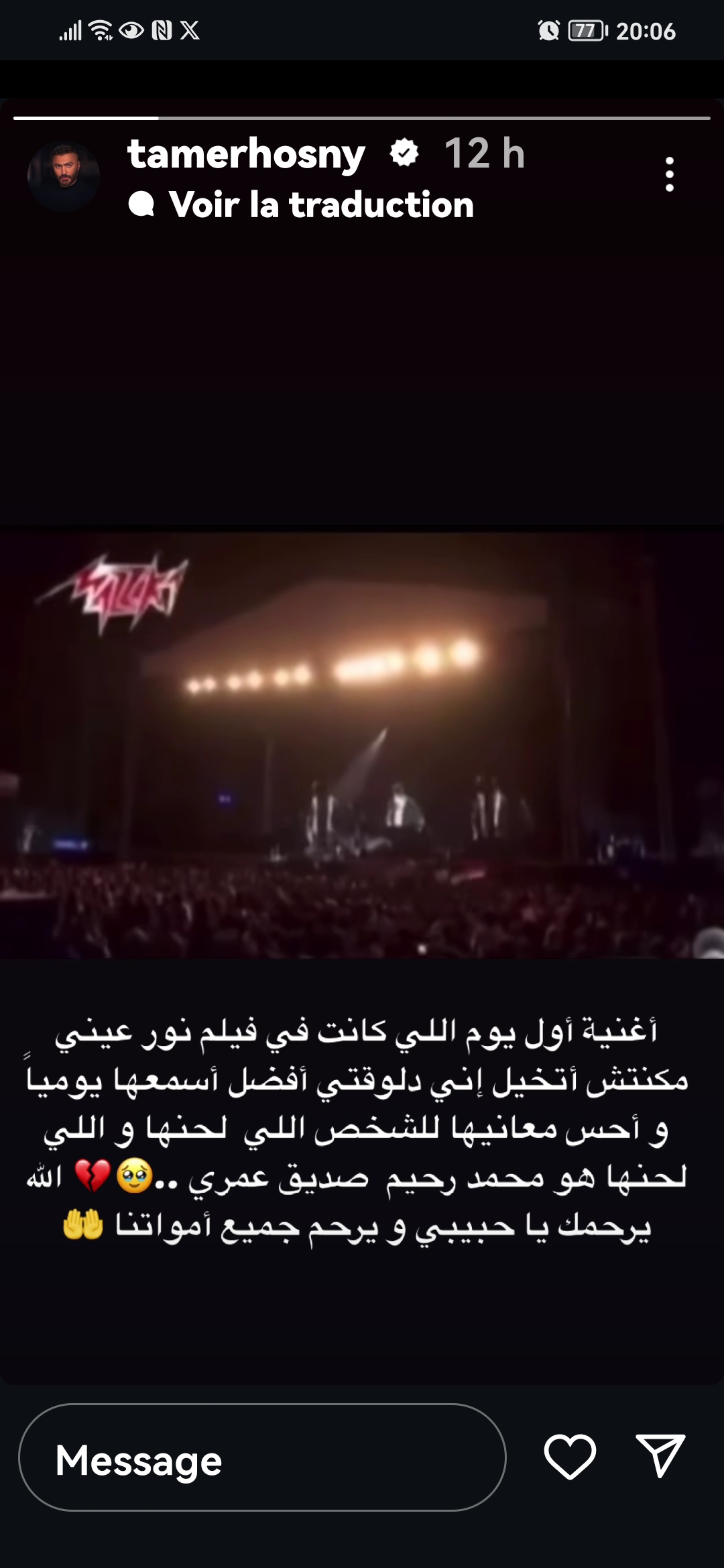 وقال تامر إنه سيظل يسمع هذه الأغنية، بحنينٍ كبير متذكرا صديق عمره الراحل محمد رحيم، فيما لا نعرف إن كان يعني ذلك أنه لن يغنّيها أبدًا على المسرح.