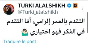 نشر المستشار تركي آل الشيخ تغريدة جديدةً، أشار فيها إلى أنّ التقدم في العمر أمر حتمي، في حين أن التقدم في الفكر يعتبر خيارًا شخصيًا.