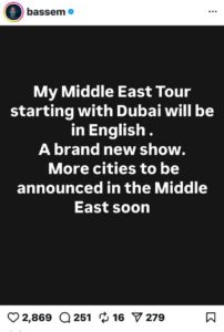 وكان باسم قد شارك عبر حسابه الرسمي على إنستغرام خبر انطلاق الجولة، مؤكدًا أن تفاصيل المدن والمحطات التالية ستُعلن قريبًا. هذه الجولة لا تُعد مجرد محطة فنية جديدة، بل انفتاحًا على أفق عالمي أوسع، ورسالة واضحة أن الكوميديا لغة مشتركة تتخطى اللغات والمسافات