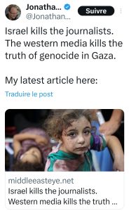 هذا الصحفي نشر على منصة “إكس” أن إسرائيل تستهدف الصحفيين، بينما يغطي الإعلام الغربي على حقيقة الإبادة الجماعية في غزة.