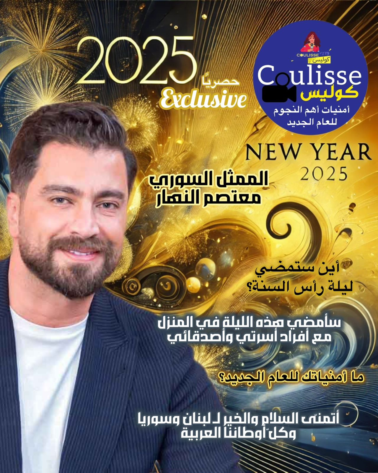معتصم قال إنّه سيمضي ليلة رأس السنة مع أصدقائه وعائلته، كما تمنى الخير لوطنه سوريا ولبنان والعالم العربي، وهو ما نتمناه بدورنا من أسرة كوليس.