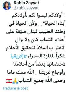 “أولادكم ليسوا لكم، أولادكم أبناء الحياة” … ولأن الحياة في وطننا الحبيب لبنان ضيّقة على أحلام الشباب، كان ولا يزال الاغتراب الملاذ لتحقيق الأحلام. شكراً للقارّة السمراء #إفريقيا لاحتضانها بعضاً من أحلامنا وأوجاع غربتنا. الله معك ماما وحمى الله جميع الشباب 🙏🇱🇧.