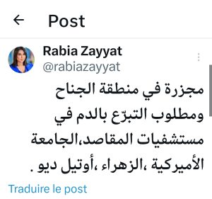 أعلنت الإعلامية رابعة الزيات حاجة مستشفيات المقاصد إلى متبرعين بالدم، بعد استهداف العدو ليلة أمس منطقة الجناح. كما طلبت رابعة التوجه إلى الجامعة الأميركية، الزهراء، اوتيل ديو.