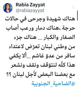 كتبت الإعلامية رابعة الزيات في منشور على منصة X: “هناك شهيدة وجرحى في حالات حرجة، هناك دمار ورعب أصاب الصغار والكبار. هناك جزء من وطني لبنان تعرض لاعتداء سافر من عدو غاشم. ألا يكفي هذا كله لنتوقف ونقف ونشعر مع بعضنا البعض لأجل لبنان؟” اختتمت رسالتها بهاشتاغ #الضاحية_الجنوبية، معبرة عن وجعها وأسفها الشديد لما يحدث.