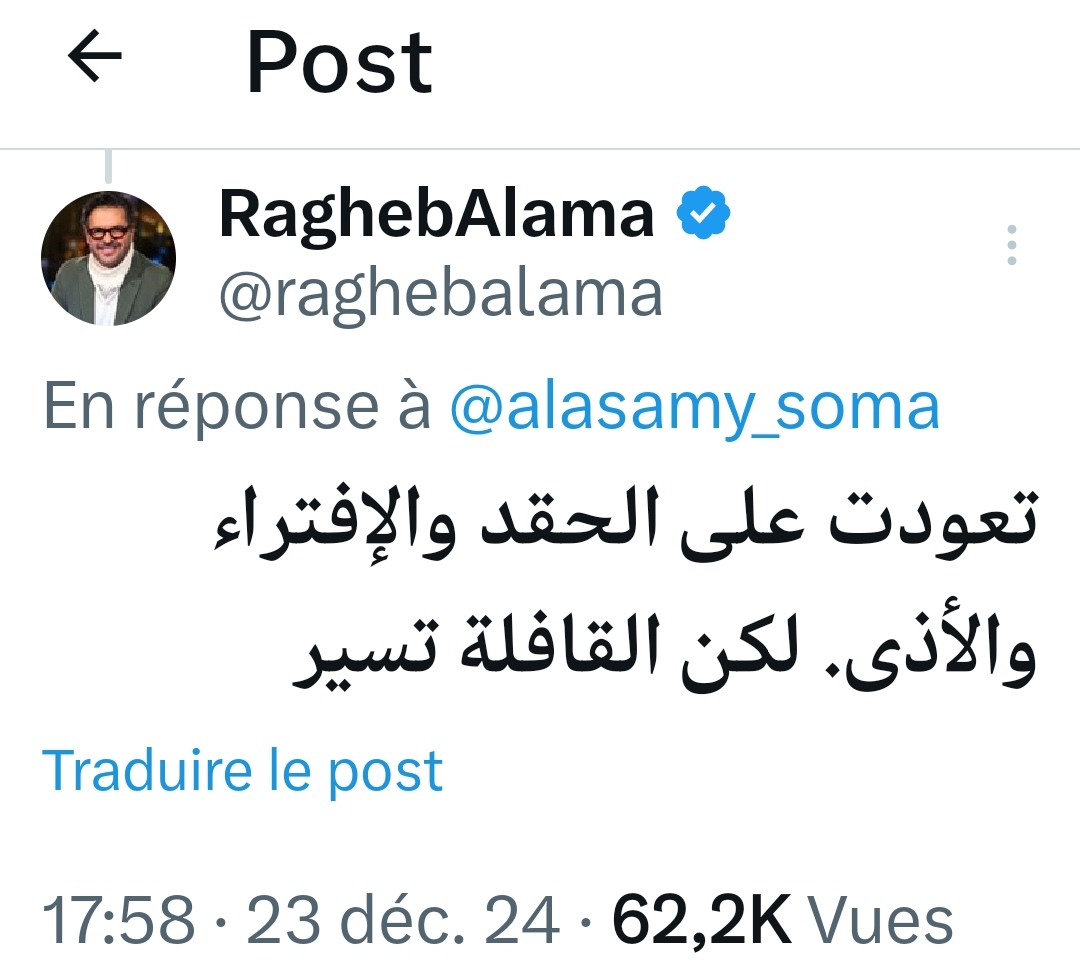 نشر الفنان راغب علامة رداً لأحد المتابعين عبر حسابه على منصة X، حيث أشار إلى تأقلمه مع التحديات المستمرة التي واجهها في مشواره المهني، قائلاً: “تعودت على الحقد والافتراء والأذى، لكن القافلة تسير”.