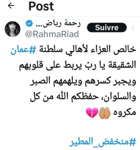 وعلقت: “خالص العزاء لأهالي سلطنة #عمان الشقيقة يا ربّ يربط على قلوبهم ويجبر كسرهم ويلهمهم الصبر والسلوان، حفظكم الله من كل مكروه 🤲🏼💔 ”