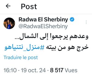 في تدوينة على منصة X، سلطت الإعلامية رضوى الشربيني الضوء على تطور سياسي مستجد بقولها: “وعدهم يرجعوا إلى الشمال…خرج هو من بيته ⁧‫#منزل_نتنياهو‬⁩”. تعد هذه العبارة هي الصائبة اليوم.