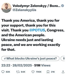 يسعى الرئيس الأوكراني فولوديمير زيلينسكي لتحسين العلاقات مع الرئيس الأمريكي دونالد ترامب. بعد مشادة كلامية دارت بينهما في المكتب البيضاوي، قام زيلينسكي بشكر الشعب الأمريكي وترامب والكونغرس عبر وسائل التواصل الاجتماعي، وأكد رغبة أوكرانيا في توقيع اتفاقية للمعادن مع الولايات المتحدة.