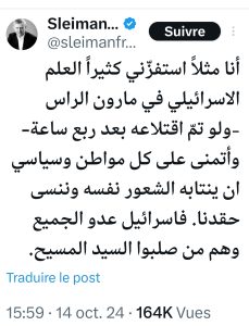 في موقف يُشيد به الجميع، نشر الوزير السابق سليمان فرنجيه عبر منصة X تعليقه على رفع العلم الإسرائيلي في مارون الراس، الذي أُزيل سريعاً.