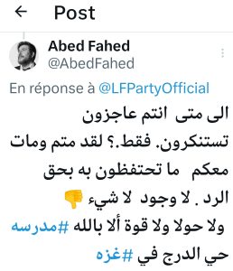 وكان عابد فهد قد كتب: “الى متى انتم عاجزون تستنكرون فقط؟ لقد متم ومات معكم ما تحتفظون به بحق الرد. لا وجود لا شيء 👎 ولا حولا ولا قوة ألا بالله ‎#مدرسه حي الدرج في ‎#غزه.”
