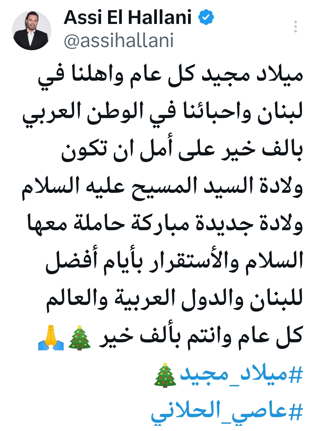 وكتب الحلاني: “ميلاد مجيد، كل عام وأهلنا في لبنان وأحبائنا في الوطن العربي بألف خير”، مشيرًا إلى رغبة صادقة في تحسين الأوضاع العامة في المنطقة.