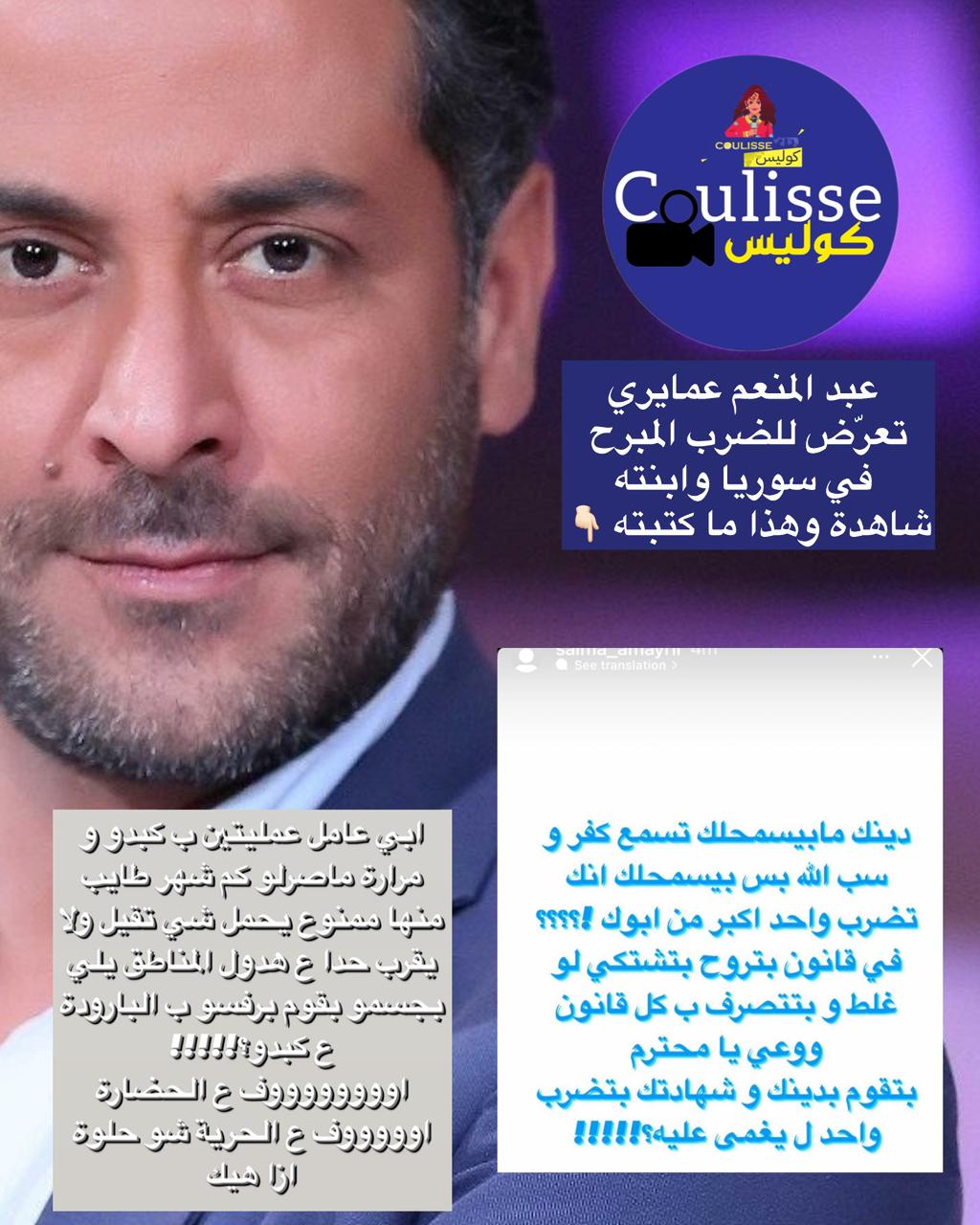 أعلنت ابنة عبد المنعم عمايري أنه قد تعرض إلى ضرب مبرحٍ في سوريا من أحد الأشخاص الذين استخدموا بارودةً.