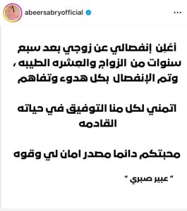 البيان جاء هادئًا ومتفهمًا، حيث شاركته صبري عبر حسابها على “إنستغرام”، متمنية التوفيق لكليهما.