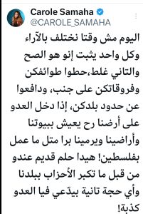 نشرت الفنانة كارول سماحةً رسالةً حذرت فيها الشعب اللبناني من التفرقة إزاء الظروف الصعبة التي يمر بها لبنان اليوم وهو يواجه العدو.