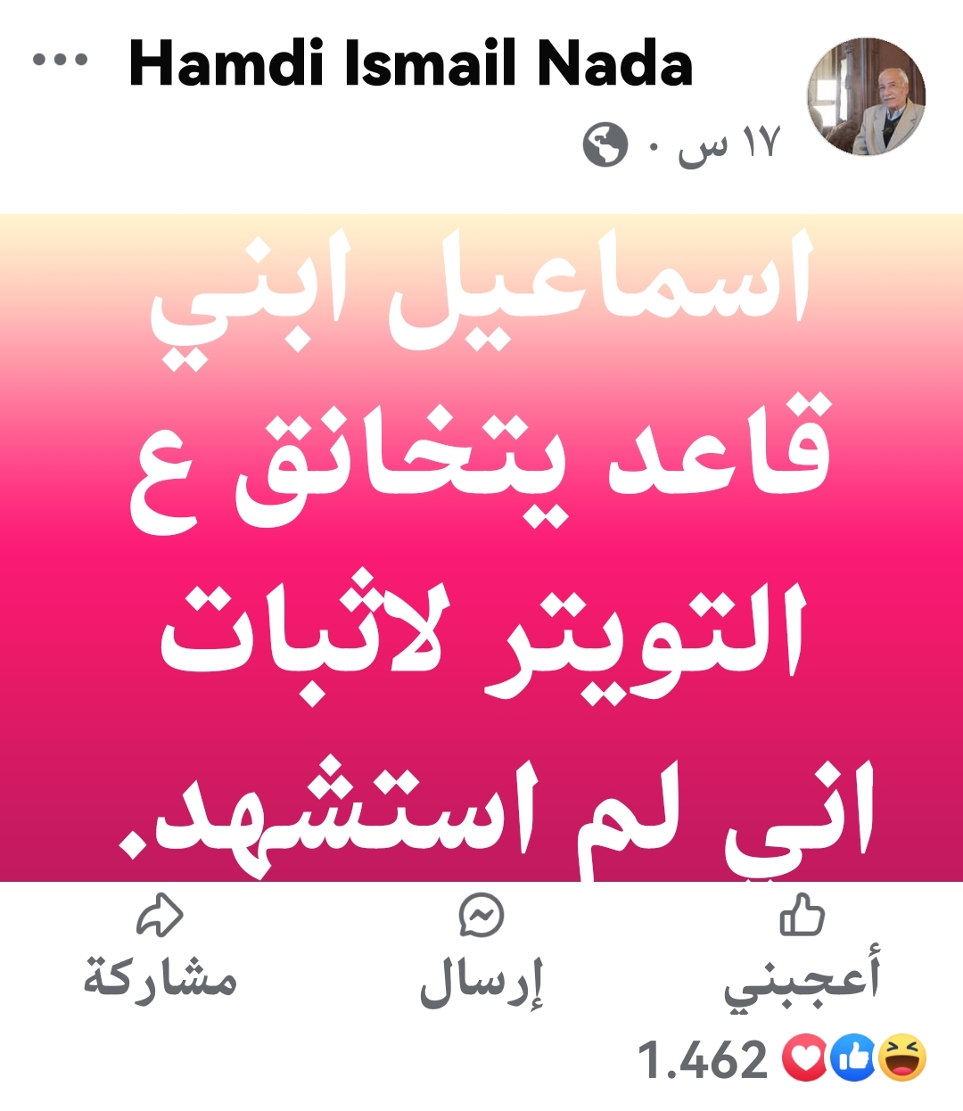وكتب اسماعيل ساخرا إن ابنه يخوض معارك افتراضية على المنصات لإثبات أنه بخير.
