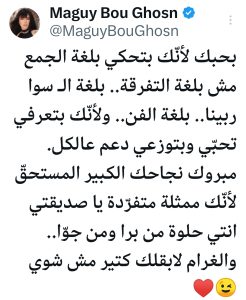 أشادت الفنانة ماغي بوغصن بزميلتها الفنانة شكران مرتجى عبر منصة X بكلمات تحمل الكثير من الحب والدعم. كتبت ماغي: “بحبك لأنّك بتحكي بلغة الجمع مش بلغة التفرقة.. بلغة الـ سوا ربينا.. بلغة الفن.. ولأنّك بتعرفي تحبّي وبتوزعي دعم عالكل. مبروك نجاحك الكبير المستحقّ لأنّك ممثلة متفرّدة يا صديقتي انتي حلوة من برا ومن جوّا.. والغرام لابقلك كتير مش شوي 😉♥️.”