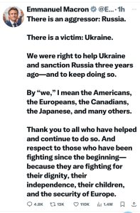 نشر الرئيس الفرنسي إيمانويل ماكرون مؤخرًا منشورًا هامًا على منصة X يوضح فيه موقفه بخصوص الأزمة الأوكرانية الروسية. أكد ماكرون في منشوره أن روسيا هي المعتدية وأن أوكرانيا هي الضحية في هذا النزاع، مشددًا على صحة مساعدة أوكرانيا وفرض العقوبات على روسيا منذ ثلاث سنوات واستمرار ذلك النهج.