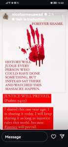 وشارك معوض صورة ليد مغطاة بالدماء تحمل عبارة “عار للأبد”، مؤكدًا أن “التاريخ سيحكم على كل من كان بإمكانه فعل شيء، لكنه اكتفى بالمشاهدة”.