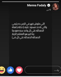 وقالت فضالي في رسالتها: “اللي ملوش ضهر في الزمن ده يترمي، واللي له حد مسنود عليه يا حظه يا هناه”، مضيفة: “الحمد لله على كل واحد سنده هو ربنا، ربنا كبير هو المنتقم الجبار”.