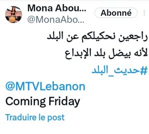 أعلنت الإعلامية اللبنانية منى أبو حمزة عودتها لتقديم برنامج حديث البلد في موسم جديدٍ عبر قناة الآم تي في.