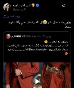 الفيديو الذي حظي#نادين_نسيب_نجيم #ظافر_العابدين بتفاعل كبير، أظهر حماس الجمهور لرؤية نادين وظافر معًا، وعلقت نادين مازحة بأن الذكاء الاصطناعي قد يغني عن التمثيل.