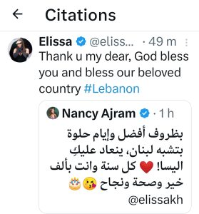 وكتبت نانسي قائلة: “بظروف أجمل وإيام حلوة بتشبه لبنان، ينعاد عليكي إليسا، كل عام وأنت بألف خير وصحة ونجاح”.