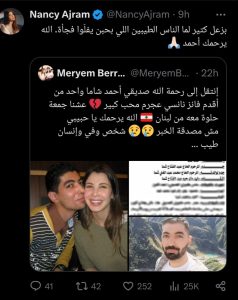 نعت الفنانة اللبنانية نانسي عجرم أحد أقدم معجبيها أحمد شما، الذي وافته المنية بشكل مفاجئ.