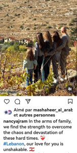 جاء في رسالة نانسي: “في حضن العائلة، نجد القوة لتجاوز الفوضى والدمار في هذه الأوقات العصيبة. 💔 #لبنان، حبنا لك لا يتزعزع.”