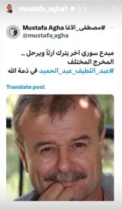 وكتب الإعلامي الشهير مصطفى الآغا: “مبدعٌ سوري آخر يترك إرثًا ويرحل المخرج المختلف عبد اللطيف عبد الحميد في ذمة الله.