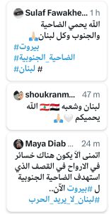 وكتبت الممثلة السورية سلاف فواخرجي التي تتضامن مع لبنان دائما: “الله يحمي الضاحية والجنوب وكل لبنان”.