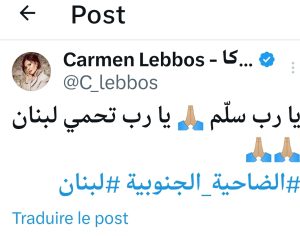 كتبت الممثلة كارمن لبس: “يا رب سلم يا رب تحمي لبنان”.