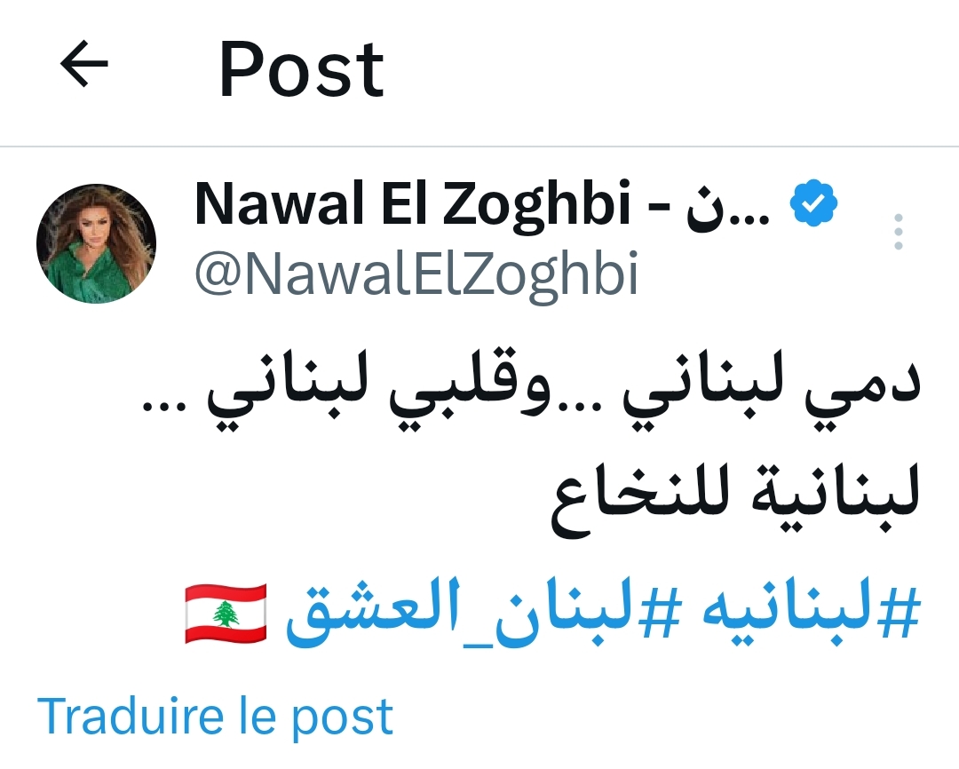 في التغريدة، كتبت نوال: “دمي لبناني… وقلبي لبناني… لبنانية للنخاع”، وأرفقتها بهاشتاغات #لبنانية و#لبنان_العشق، مع رمز علم لبنان 🇱🇧.