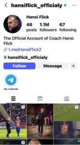الحساب يحمل اسم @hansiflick_officialy ويضم أكثر من 1.1 مليون متابع، ما يعطيه مظهرًا رسميًا، إلا أن الكلمة الأخيرة مكتوبة بشكل خاطئ (officialy بدل officially).