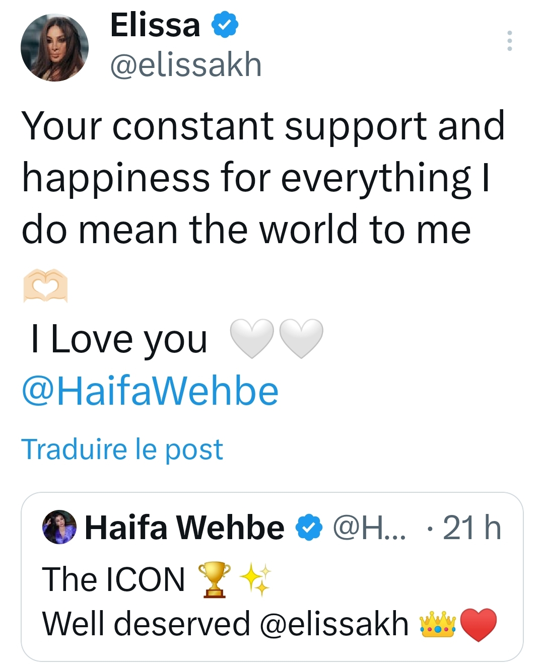 في حين أشادت النجمة هيفاء وهبي، المعروفة بجمالها وحضورها المميز، بدعمها المطلق لإليسا من خلال تعليق مؤثر، واصفة الفنانة الجميلة إليسا بـ”الأيقونة” ومؤكدة استحقاقها الكامل لهذا التكريم.