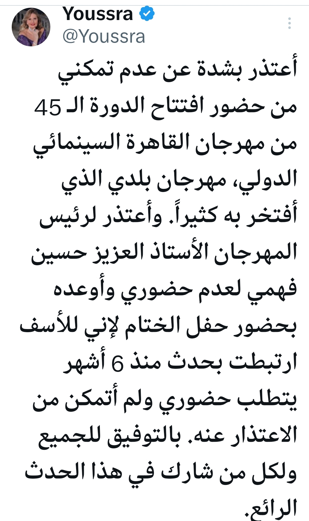 أكدت يسرا في تغريدتها بأنها تفخر كثيراً بهذا المهرجان الذي يمثل بلدها، وقدمت اعتذارها لرئيس المهرجان، الأستاذ حسين فهمي، لعدم تمكنها من الحضور.
