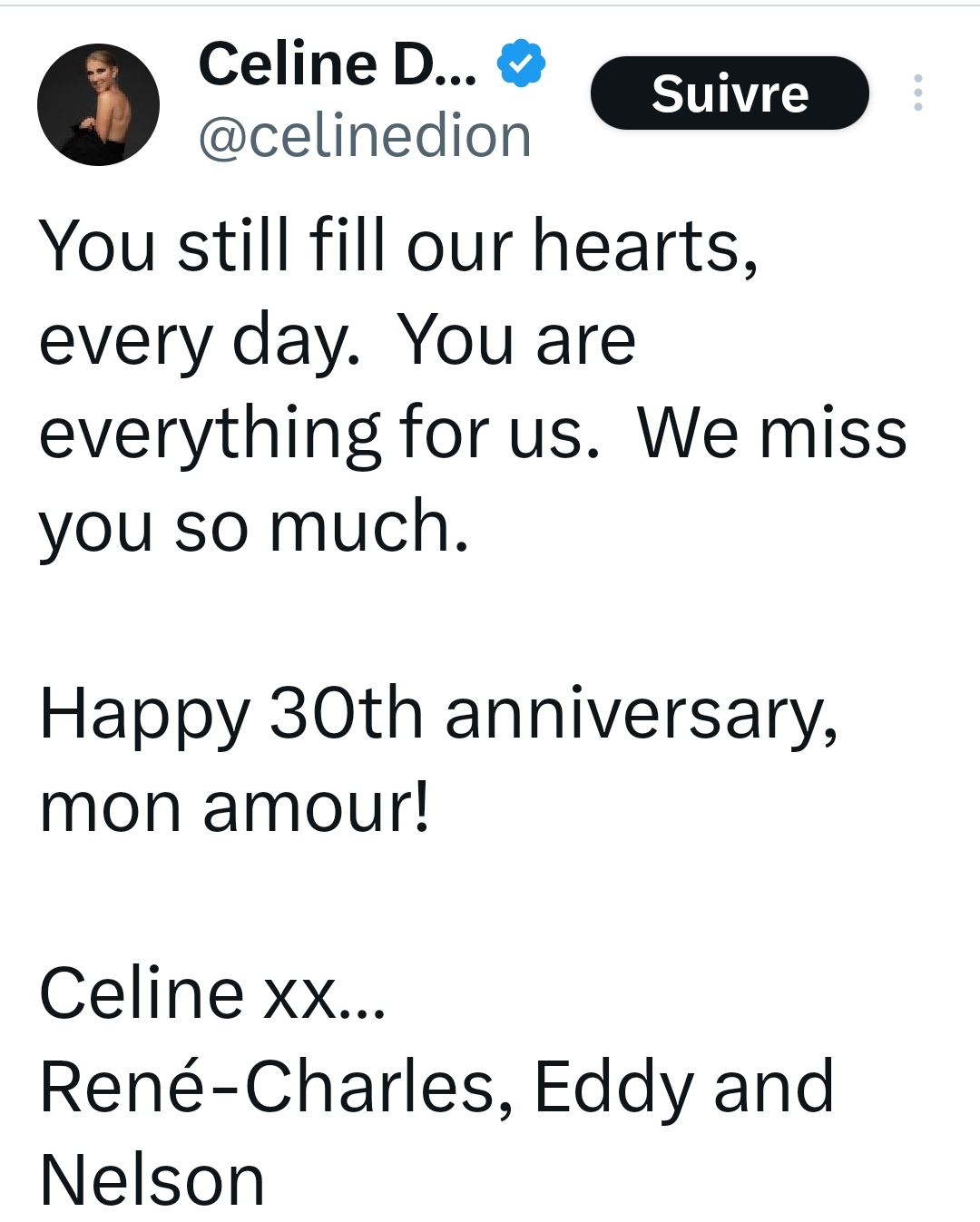 Céline was joined in her message by their children, René-Charles, Eddy, and Nelson. This shows how important René’s memory is to their family. The number 30 highlights how many years they would have been celebrating together.